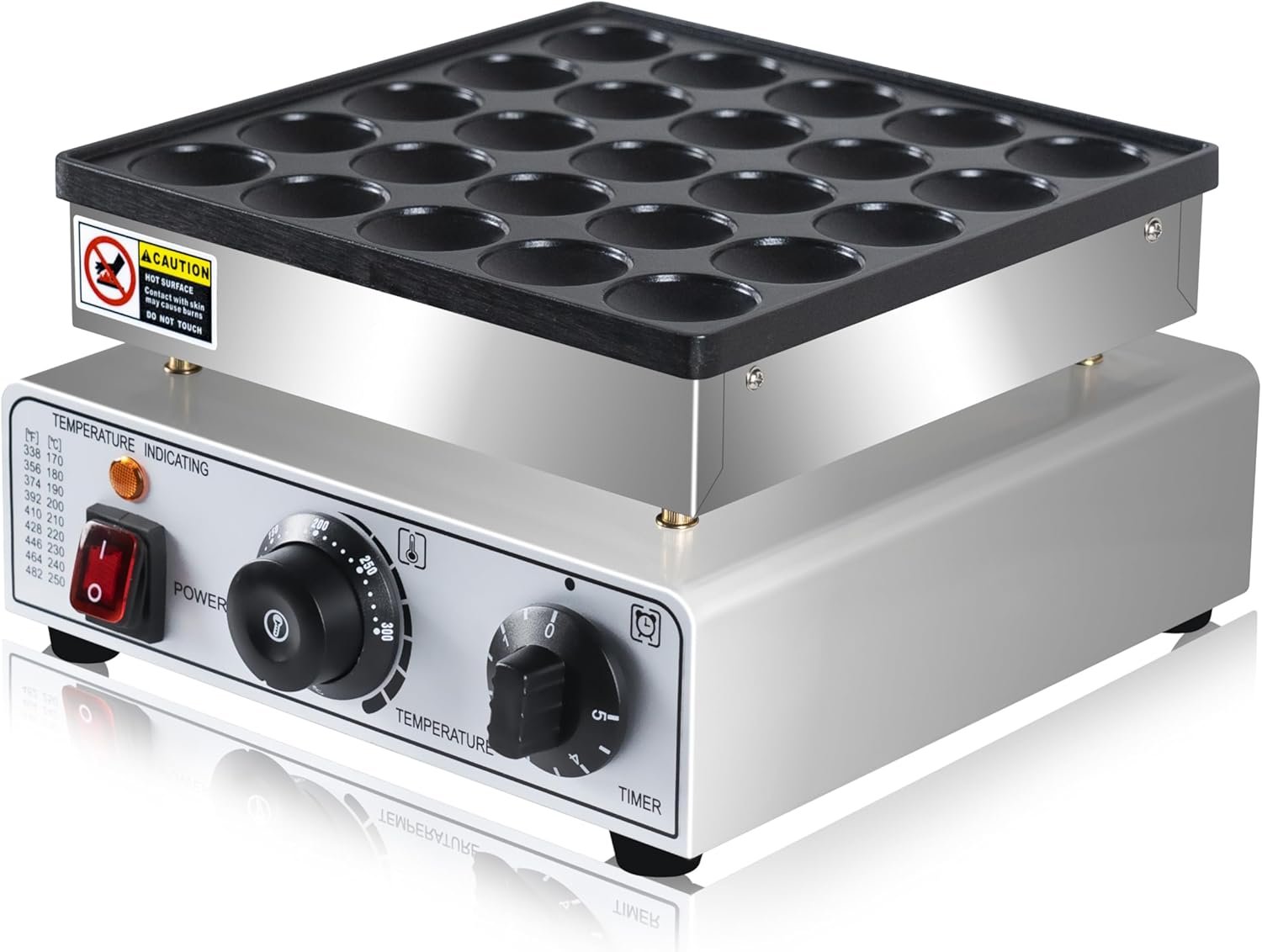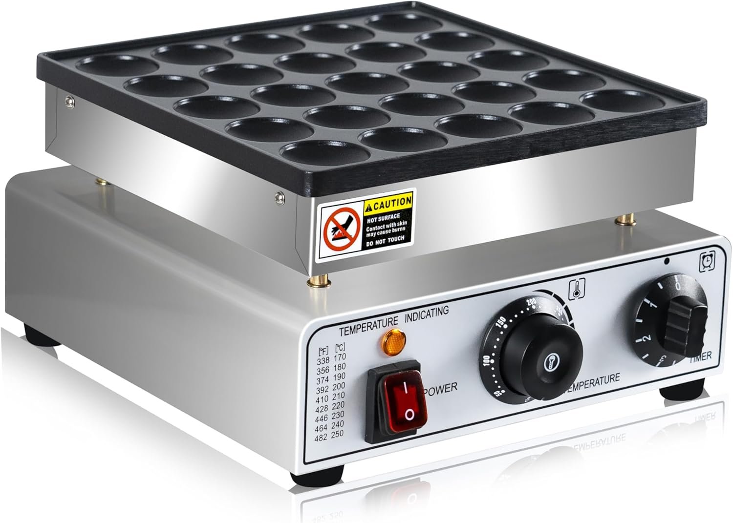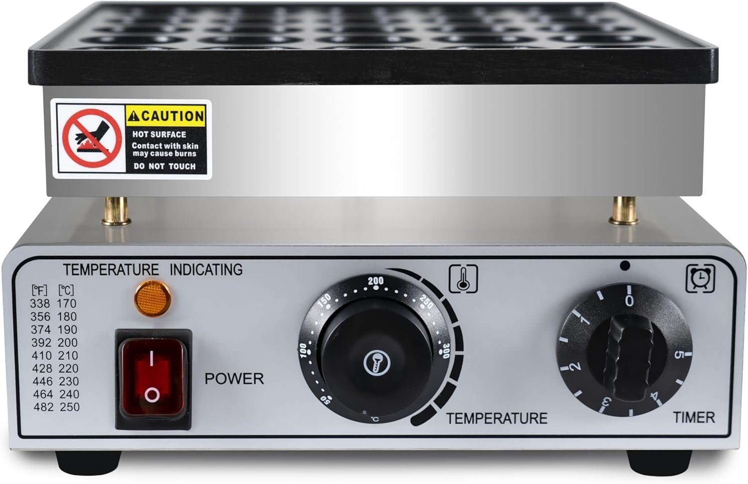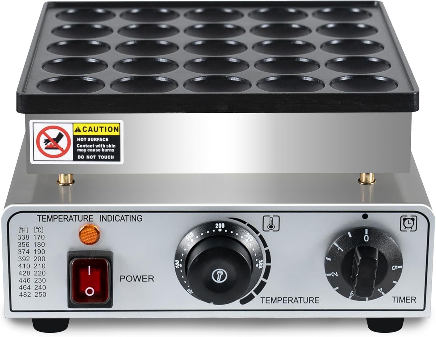 - Precise Temp & Time Control: This dutch mini pancake maker is designed with a precise temperature control system, with temperature range from 50-300℃ (122-572℉) and the timer can be set within 5 minutes. You can easily and precisely control the cooking time and temp with the 2 knobs on the panel. .