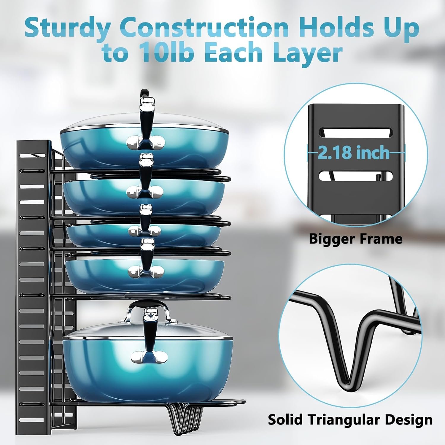 - Super Solid & Sturdy Structure – Upgraded heavy-duty iron construction holds your precious pots/pans steadily and securely; this kitchen cabinet organizer won’t warp, crack, stain or rust, and is super easy to clean; definitely your great helping hand in kitchen organization and storage