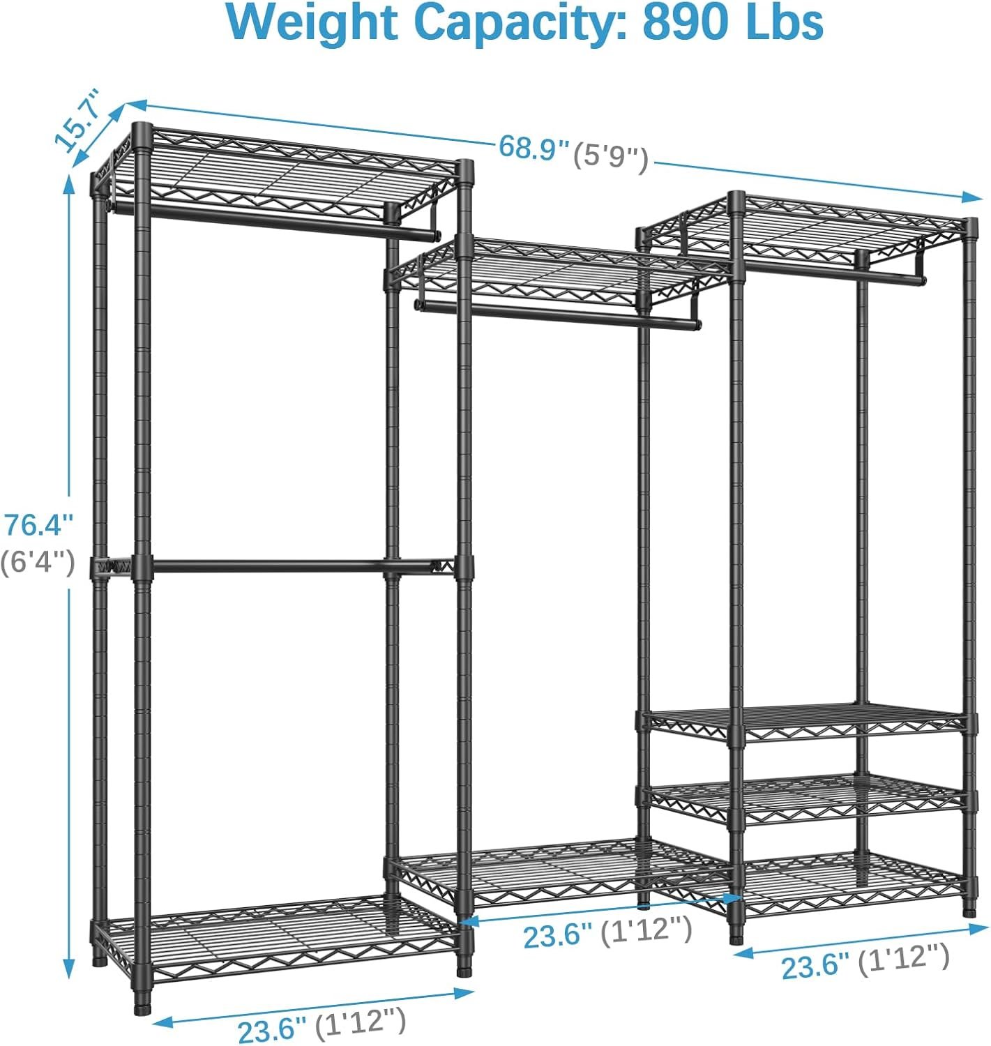 • Multifunction Closet Rack: 6 Tiers Closet Rack maximize the storage area, ensure you enough space to place your clothes, accessories, bedding, lining, shoes, etc. The 4 pcs clothes hanging rods hold up to 60 lbs for each, it is great for hanging suits, coats, long dresses, jackets, pants, shirts or other heavy clothes.